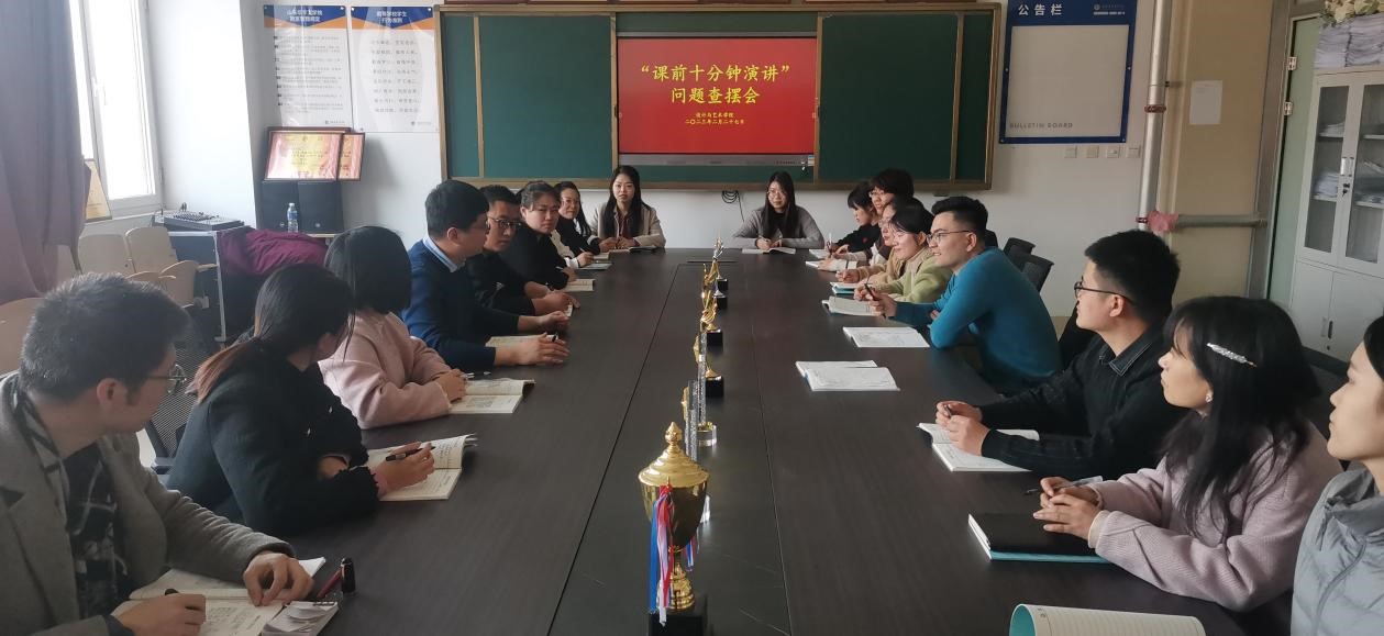 为帮助员工尽快进入常态化学习状态,发现各班级在组织“课前十分钟演讲”活动过程中的问题,学院于2023年3月27日在22号楼309召开“课前十分钟演讲”活动问题查摆会,全体员工管理人员参加本次会议。