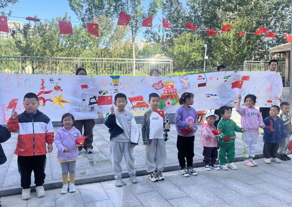 活动当天,同学们身着统一的服装,手持鲜艳的小国旗,身贴精心设计的国庆主题贴纸,脸上洋溢着对祖国的热爱与祝福。他们满怀激情地投入到绘画创作中,一幅长达百米的画布成为了他们共同挥洒创意的舞台。同学们挥毫泼墨,用画笔勾勒出祖国的壮丽山河,用色彩渲染出节日的喜庆氛围。同时,他们还耐心指导小朋友们完成了一幅幅充满童趣与创意的画作,这些作品不仅展现了孩子们的天真与想象,更传递了对祖国的深情厚谊。