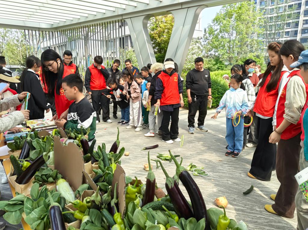 随后,进入激动人心的游戏环节,滚铁环、套圈、投壶三个经典游戏依次展开。每成功通关一个游戏,青少年们就能获得对应数量的游戏币,这些游戏币与之前获得的图书币,成为了兑换蔬菜、书籍的 “通行证”。活动现场的兑换区摆满了新鲜的蔬菜和各类书籍,青少年们拿着自己辛苦获得的“财富”,兴奋地挑选着。