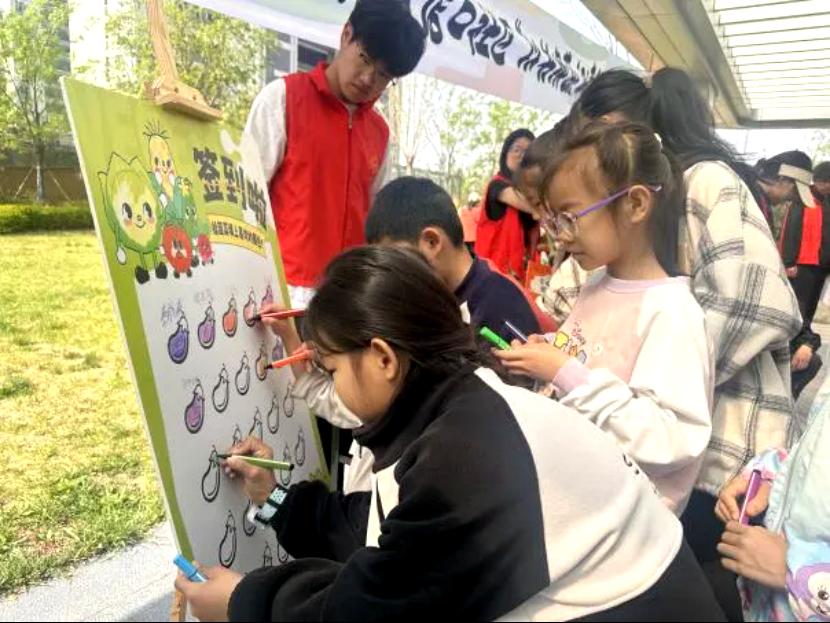 活动当天,云湖四季广场上的签到板早早立起,充满童趣的设计吸引着陆续到来的青少年。他们握着彩色画笔,在签到板上郑重写下自己的姓名,稚嫩的笔迹或工整或俏皮。签到环节还别出心裁地加入了蔬菜涂鸦,青少年们拿起颜料涂上自己喜欢的颜色。